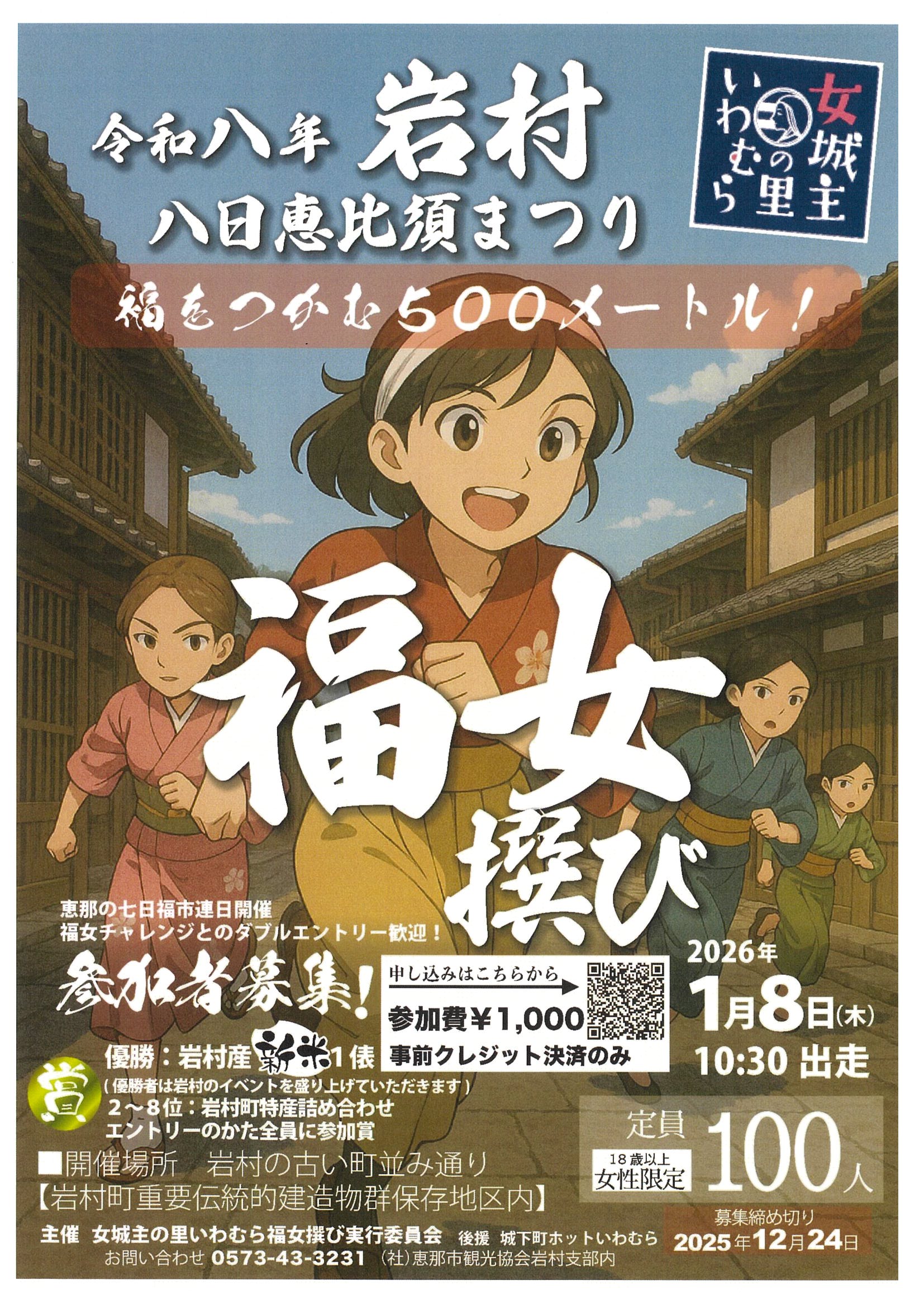 女城主の里で知られる「岩村町」で行われる「八日恵比須まつり」にて第1回「女城主の里」いわむらの福女選びを開催します。1月7日に行われる福女チャレンジとのダブルエントリーも大歓迎です。ぜひ参加してみてください。詳細は下記のリンクからご確認ください。