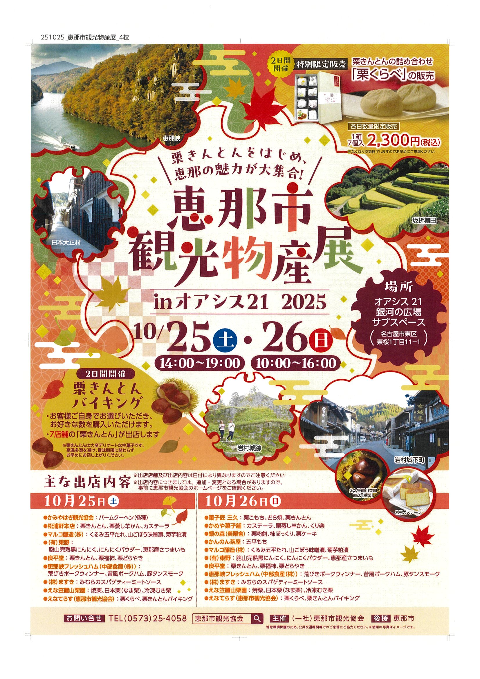 今年は、オアシス21で、恵那の特産品と観光をPRします。10/25(土)14:00~19:00 10/26日(日)10:00~16:00の2日間で恵那の「秋」を堪能してください。