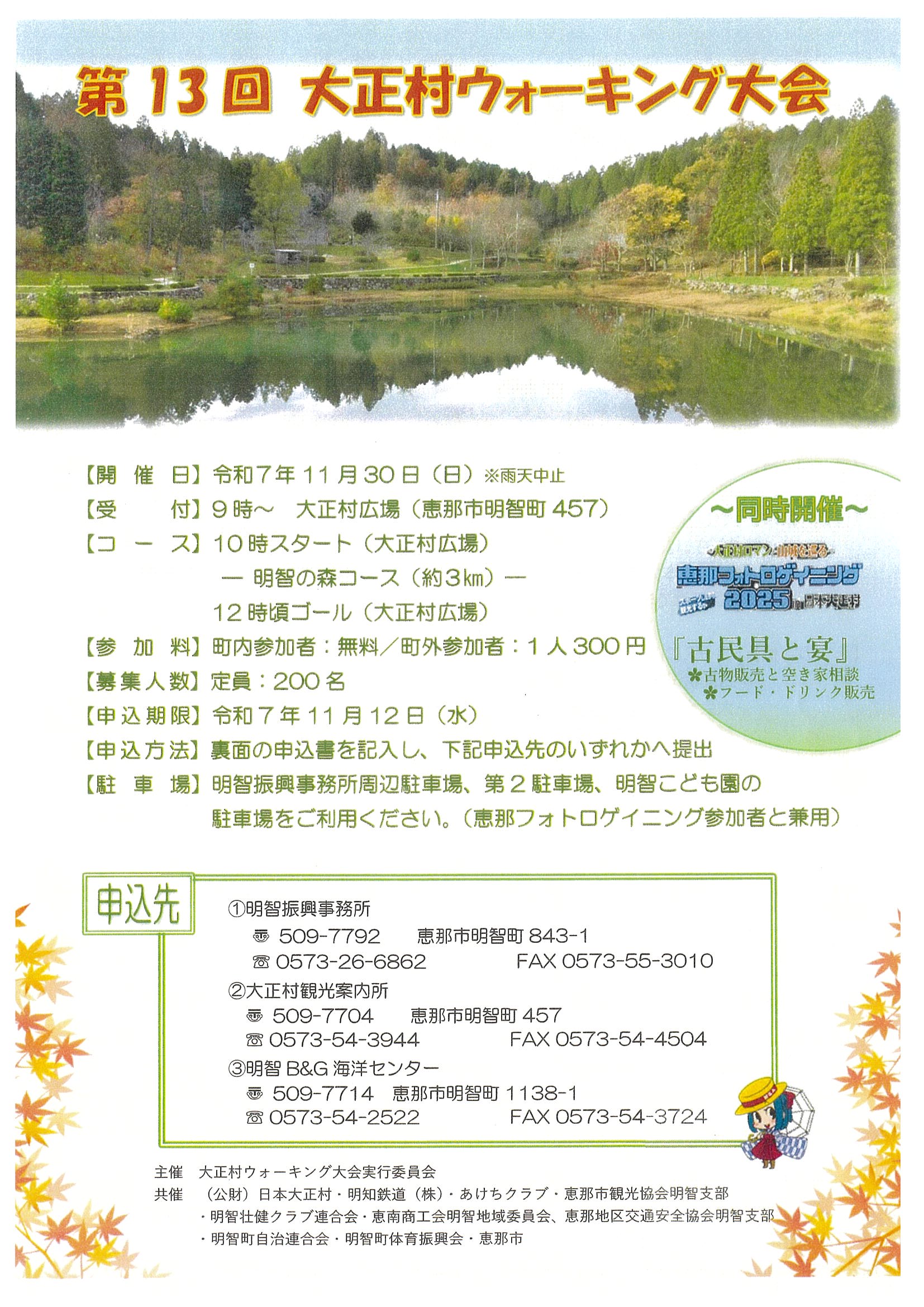 | TEL | 明智振興事務所内 0573-26-6862 大正村観光案内所 0573-54-3944 明智B&G海洋センター 0573-54-2522 |