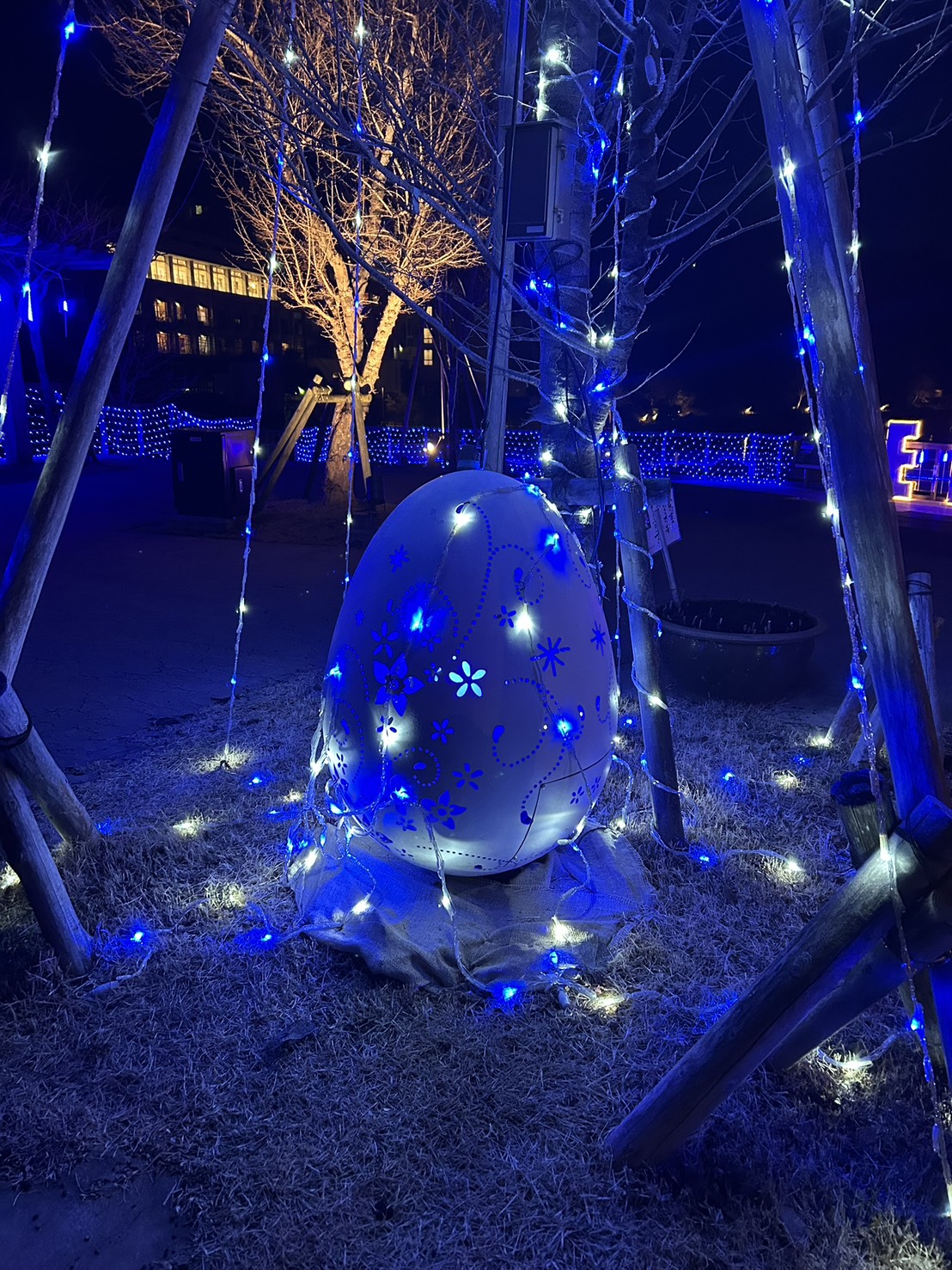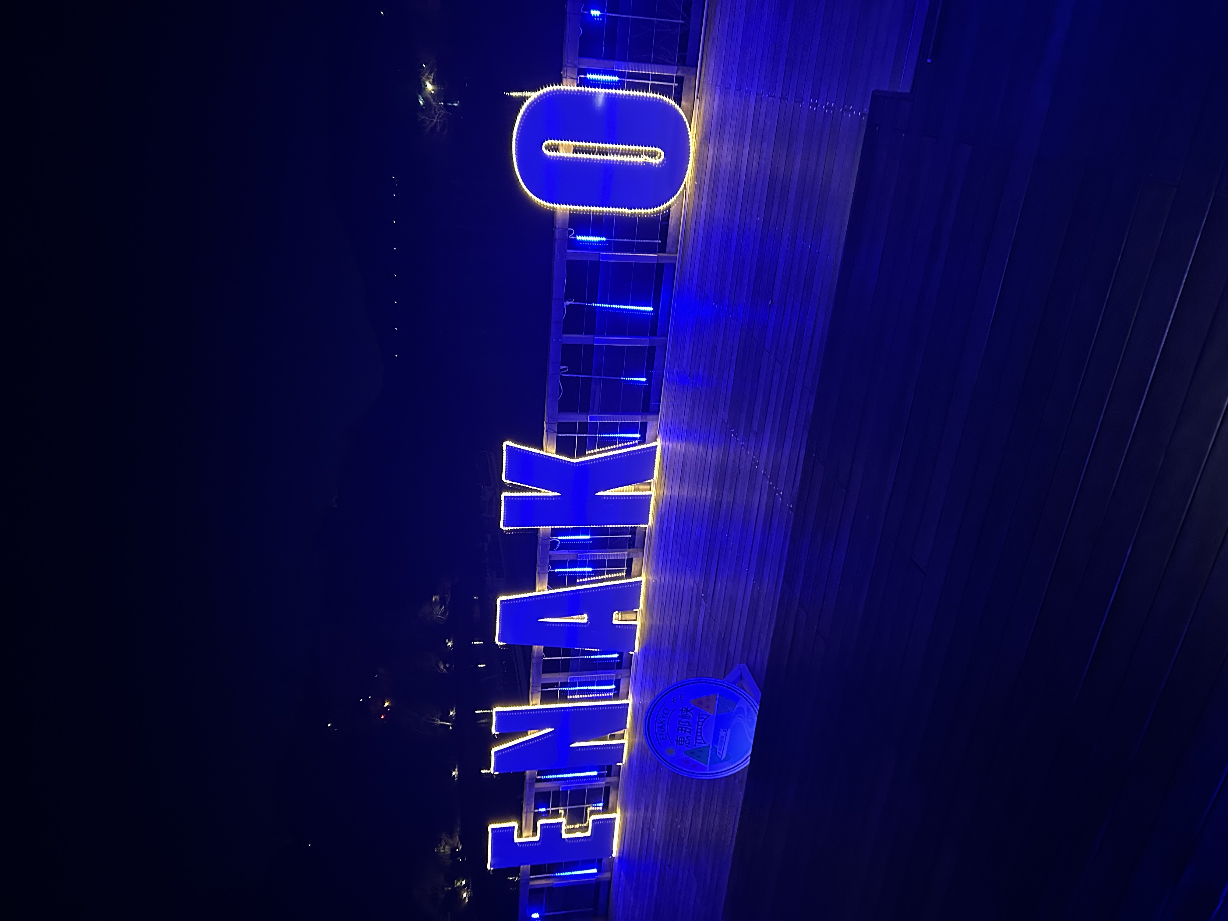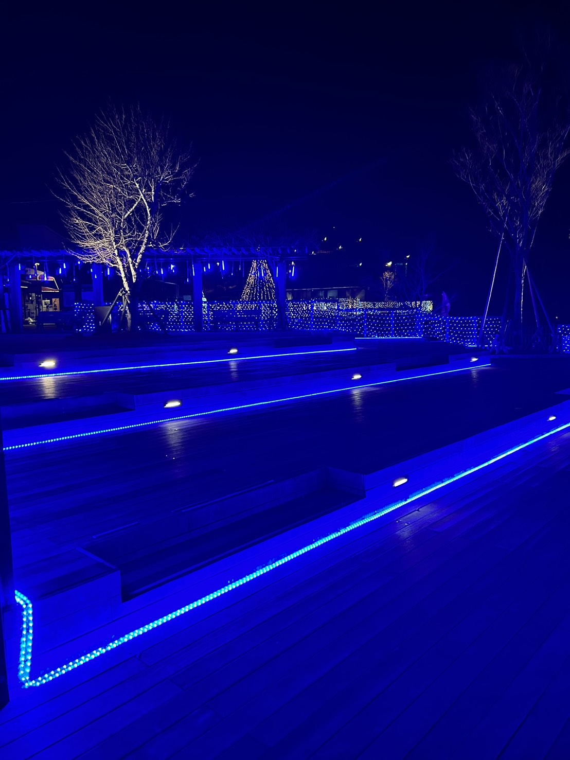 ウッドデッキ広場にあるENAK_Oモニュメントの文字間にブルーのシャワーライトが点滅し、階段にはブルーのロープライトが点滅して、青の広場を演出します。
